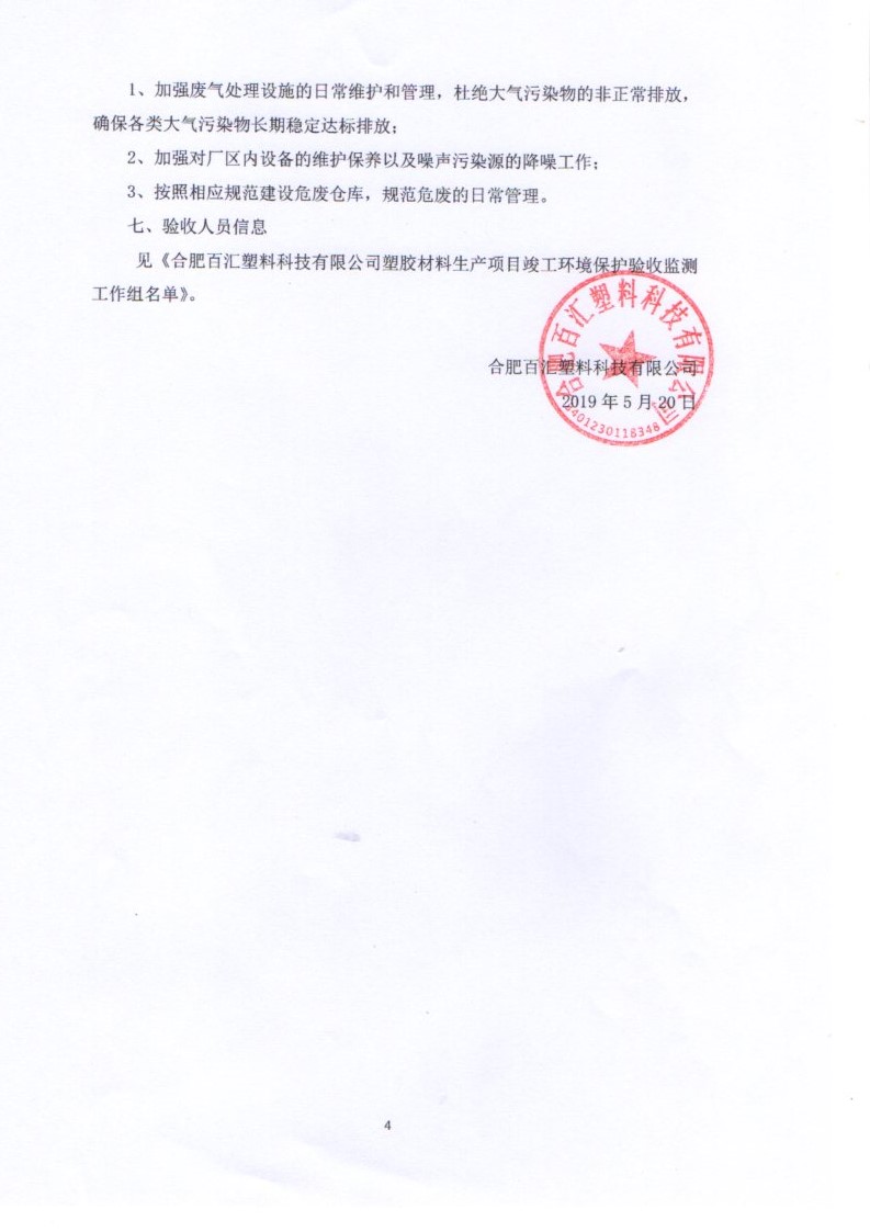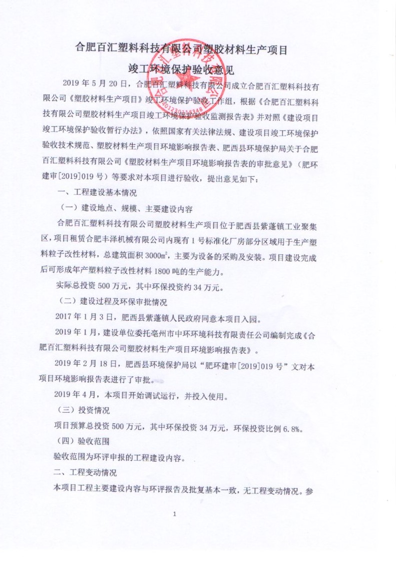 合肥百匯塑料科技有限公司塑膠材料生產(chǎn)項(xiàng)目竣工環(huán)境保護(hù)驗(yàn)收?qǐng)?bào)告公示